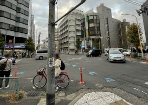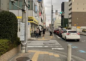 6.そのまま進んでいただき、十字路の交差点で向かいのパソコン販売店側にわたって右へお進みください。